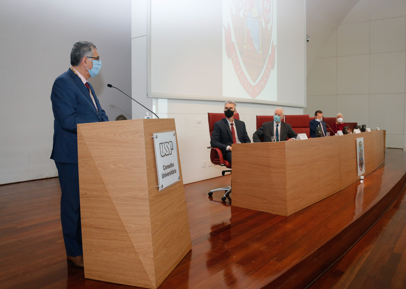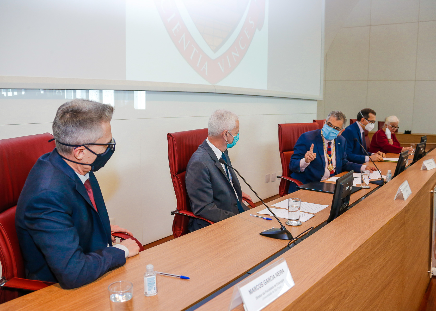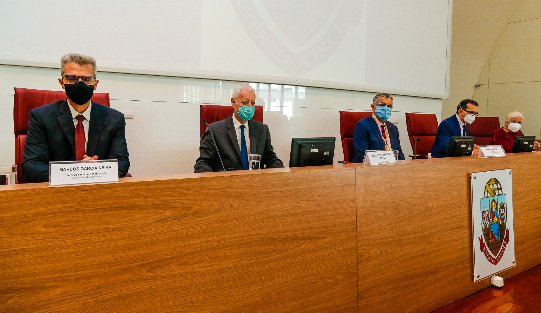 Cerimônia para outorga do título do doutor “Honoris Causa” ao Prof. Dr António da Nóvoa. Autoridades presentes: Vahan Agopyan (reitor da USP), Marcos Neira (diretor da FEUSP), Denice Catani e Carlota Boto. Local: Sala do Conselho Universitário. Foto: Cecília Bastos/USP Imagem